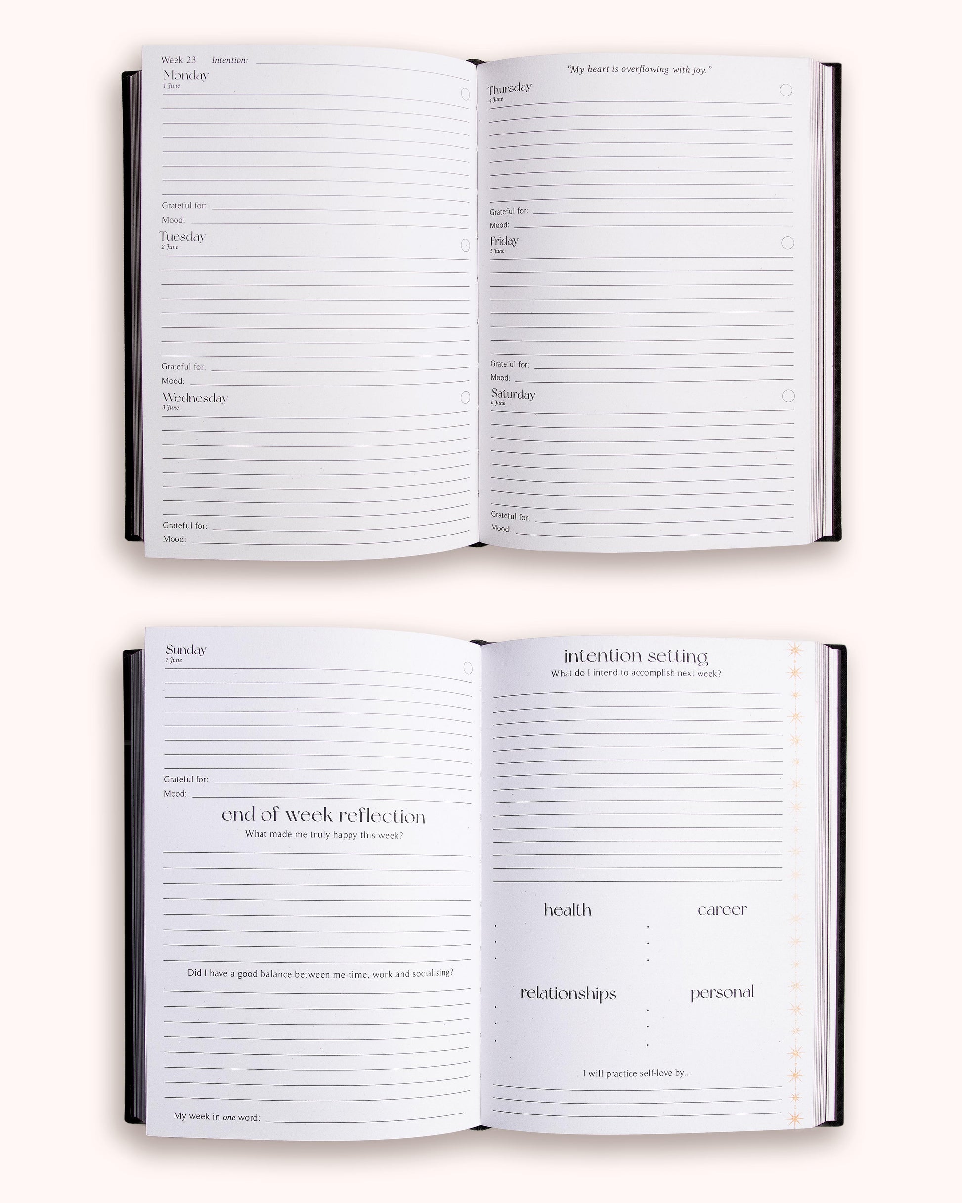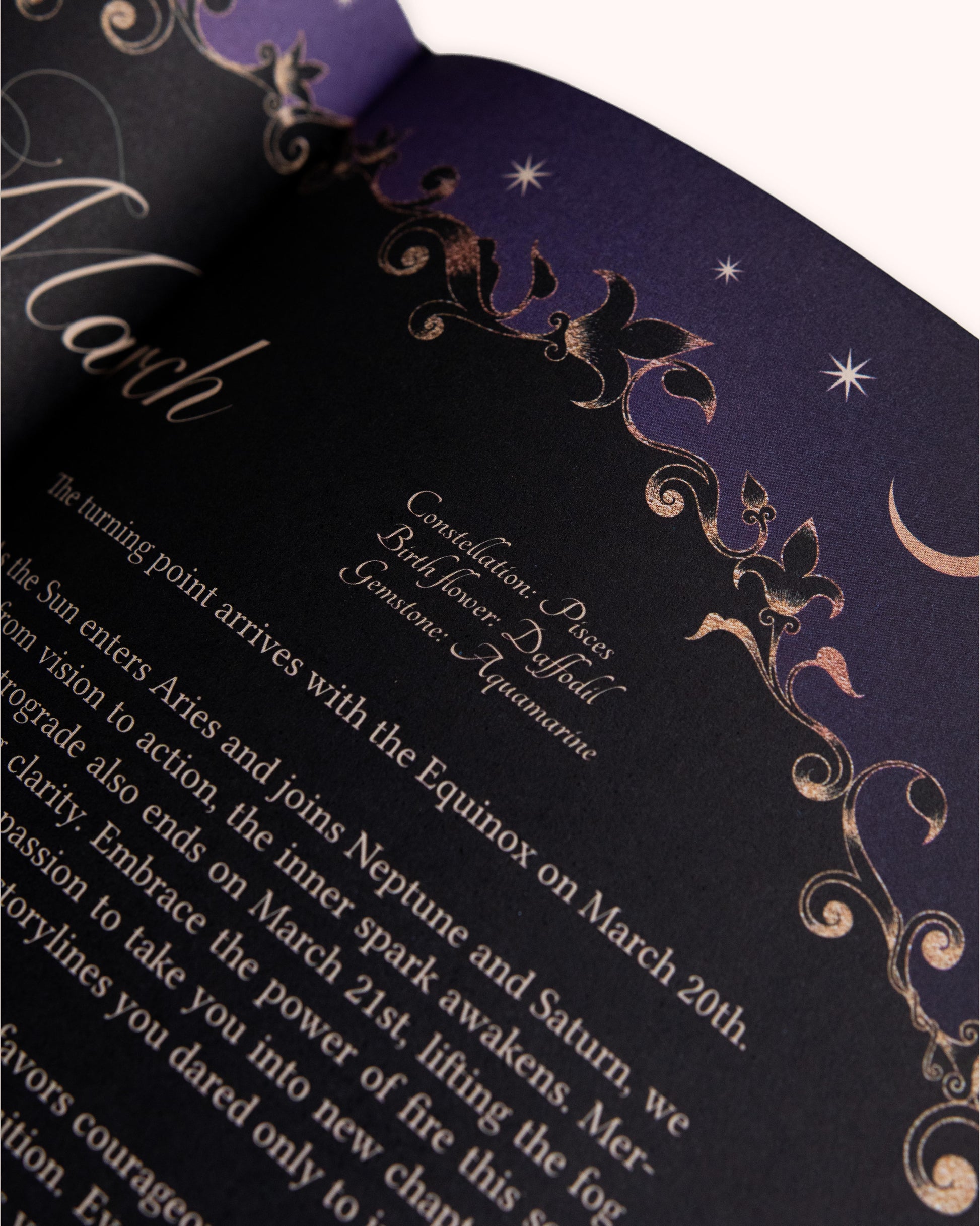 De textura suave, cuerpo firme y diseño celestial, está pensado para acompañarte día a día como una cápsula del tiempo que atesorará tus pensamientos, sueños y evolución durante todo el año.